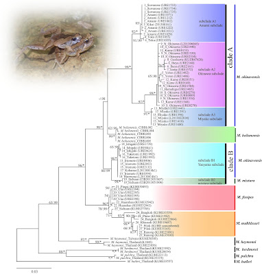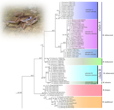 Atsushi Tominaga, Masafumi Matsui, Naoko Shimoji, Wichase Khonsue, Chi‐Shiun Wu, Mamoru Toda, Koshiro Eto, Kanto Nishikawa and Hidetoshi Ota. 2019. Relict Distribution of Microhyla (Amphibia: Microhylidae) in the Ryukyu Archipelago: High Diversity in East Asia maintained by Insularization. Zoologica Scripta. 48(4); 440-453. DOI: 10.1111/zsc.12361