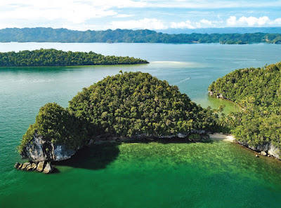 | Figure 6. Fuum Islet (foreground), the type locality of Pomacentrus bellipictus. Type specimens were collected from the mostly shaded area adjacent to the rocky shoreline (M.V. Erdmann). |