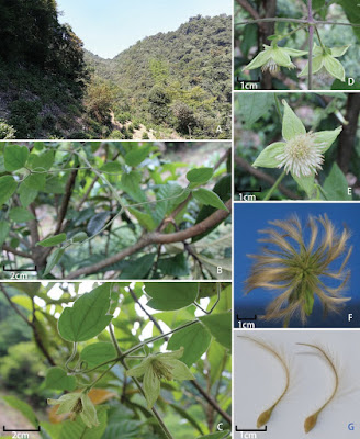 | Figure 3. Clematis guniuensis W.Y.Ni, R.B.Wang & S.B.Zhou. A Habitat B Young branches, showing stems 6–grooved, puberulous C Inflorescences, showing style and abaxial surface view of leaf blade D Dorsal view of cymes, showing peduncles and bracts E Frontal view of flower, showing stamens F Fruit G Achenes, showing persistent style. |