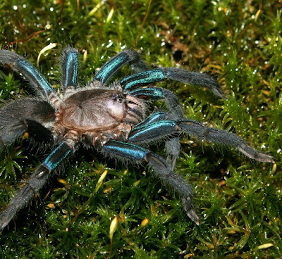 The new species of Chilobrachys was collected from a fragmented rainforest patch, 347 hectares in extent, located in the Kalutara District, Western Province of Sri Lanka. The specimens were collected from burrows on a soil embankment covered with bryophytes, along the road, with a clear tubular extension made up of soil and other debris. Interestingly, the majority of the known members of the genus Chilobrachys are shades of brown, black or grey, and lack vibrant colours or iridescent sheens on their dorsal surface. The collected specimen on the other hand has a metallic turquoise-blue sheen on all four legs and also an iridescent sheen on the carapace and abdomen. As such, the collected specimen, differs greatly from the other members of the genus, including C. nitelinus, thereby warranting its taxonomy description as a new species. The discovery was part of an ongoing, island-wide study on the mygalomorph spiders in Sri Lanka. Here we describe the second species of Chilobrachys from Sri Lanka after 126 years.