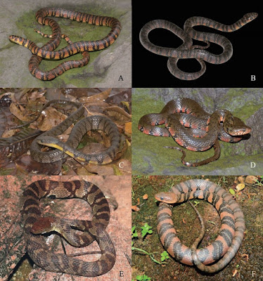 Figure 5: General view comparisons of Trimerodytes species in life, showing diagnostic character of annulated color patterns of this genus. (A) T. balteatus (CIB 109017; adult female; Guangxi, China); (B) T. balteatus (CIB 109017), showing coloration before shedding; (C) T. percarinatus (adult male; K Bang, Gia Lai, Vietnam); (D) T. annularis (CIB 109020; subadult male; Guangxi, China); (E) T. aequifasciatus (IEBR 3630; adult female; Bac Giang, Vietnam; from Le et al., 2015); (F) T. yunnanensis (IEBR A.2015.12; adult male; Dien Bien, Vietnam; from Le et al., 2015).