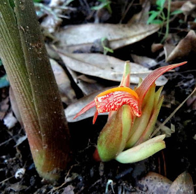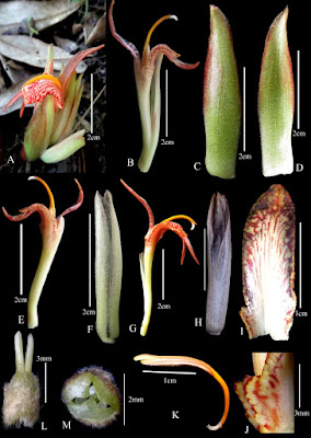 | Figure 2. Zingiber perenense N. Odyuo, D.K. Roy, C. Lyngwa & A.A. Mao: A. Inflorescence, B. A flower with bract and bracteole, C. Bract (dorsal view), D. Bract (frontal view), E. A flower with bracteole, F. Bracteole (frontal view), G. A flower, H. Calyx, I. Labellum, J. Lateral staminodes, K. Stamen, with style and stigma, L. Ovary and epigynous glands, M. Transverse section of ovary. Photographed by Dilip Kr. Roy. | Zingiber perenense N. Odyuo, D.K. Roy, C. Lyngwa & A.A. Mao, sp. nov. Diagnosis: The new species differs from its allied congeners, Z. kangleipakense in pubescent, bilobed ligule, oblonglanceolate bracteole longer than corolla tube with 2-dentate apex, pubescent corolla tube with red lobes, white with purplish red streaked labellum, stalked anther with 3–4 mm long filament and in comparatively shorter style, 4.5–5 cm long and from Z. roseum in ovate to oblanceolate leaf blade pubescent on both sides, comparatively shorter, 1.5–3 cm long peduncle, oblong-lanceolate to oblong-linear pale green to creamy white bracts, corolla tube shorter than bracts, white with purplish red streaked labellum, with reduced, ovate, 2-dentate lateral staminodes and in pollen grains with striae non-confluent at apices. Distribution. INDIA: Nagaland ( Peren district, Tesen village forest). So far only known from the type locality. Etymology. The specific epithet refers to the place of occurrence of this species. Nripemo Odyuo, Dilip Kr. Roy, Chalbasson Lyngwa and Ashiho A. Mao. 2019. Zingiber perenense, A New Species in Zingiber section Cryptanthium (Zingiberaceae) from Nagaland, India. The Thailand Natural History Museum Journal. 13(1); 1-10. | 5:22a |