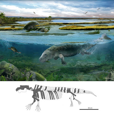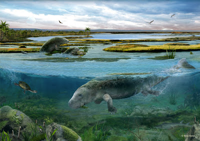 | Fig. 1: Life restoration based on cranial and postcranial bones of the middle Eocene (Lutetian) sirenian Sobrarbesiren cardieli Díaz-Berenguer et al., 2018, from the northeastern Atlantic coast (Bay of Biscay, Spain), the first adequately-known quadrupedal sirenian from Eurasia, which inhabited a deltaic plain.