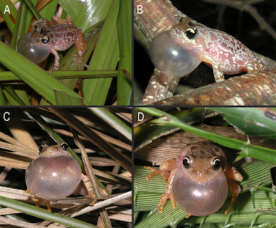 | Males of (A–B) Scinax fontanarrosai sp. n. and (C–D) S. uruguayus calling at breeding sites. |