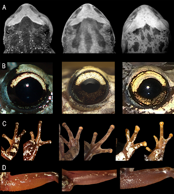 | Fig 3. Adult external morphological characters. Scinax fontanarrosai sp. n. (left), S. pinima (central), and S. uruguayus (right). (A) Head in dorsal view. (B) Color pattern of the bicolored iris. (C) Dorsal views of right hand and foot showing the color pattern of the discs in life. (D) Color pattern of the posterior surface of thighs in life. |