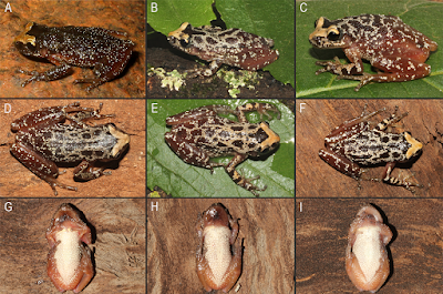 Etymology: The new species is named in honor to the writer and cartoonist Roberto “El Negro” Fontanarrosa (1944−2007), in recognition of his vast contribution to the Argentinean culture. His work always included elements of nature, like the amphibians.  | Fig 4. Color pattern of Scinax fontanarrosai sp. n. in life. (A–C) Dorsolateral, (D–F) dorsal, and (G–I) ventral views. |