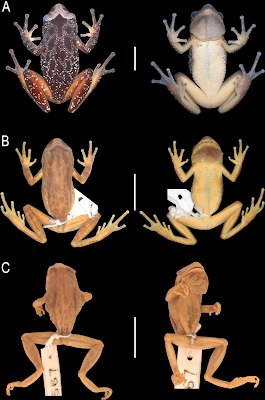| Fig 1. Dorsal (left) and ventral (right) views of the body. (A) Scinax fontanarrosai sp. n. (LGE 4451, holotype), (B) S. pinima (WCAB 46238, holotype; now MZUSP 73668), and (C) S. uruguayus (FMNH 10567, holotype). Scale bars = 50 mm. |