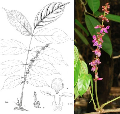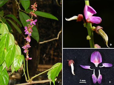 | Millettia suddeei: C. Leaves and inflorescence; D. Part of the inflorescence; E. Papilionaceous flower (Right) and stamens (Left).