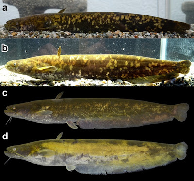 | FIGURE 7. Variation in Silurus tomodai sp. nov. a. Live specimen, ANSP 203160, paratype, 255 mm SL, Shonai River system, Gifu Prefecture (photographed by T. Nishimura); b. live specimen, FRLM 52858, paratype, 210 mm SL, Shonai River system, Gifu Prefecture; c. fresh specimen, ANSP 203160 (just after death); d. fresh specimen (about six hours after death), FRLM 52858. |