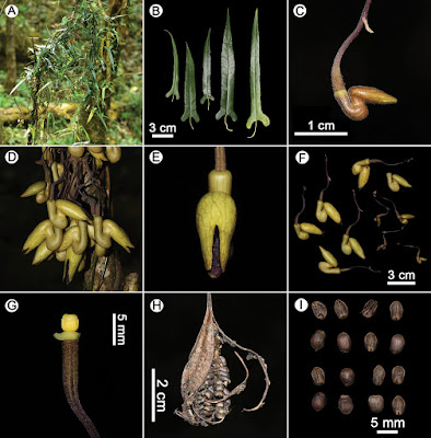 | Figure 2. Isotrema cangshanense X.X.Zhu, H.L.Zheng & J.S.Ma, sp. nov. A habit B leaves C flower bud D inflorescence E flower (front view) F flowers (lateral view) G anthers and gynostemium H the dehiscent capsule I seeds. Photographed by Xinxin Zhu. |