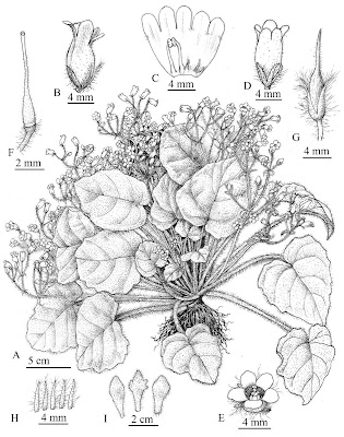 Fig. 1. Primulina yulinensis A: Flowering habit. B: Flower in side view. C: Opened corolla. D: Flower in top view. E: Flower in face view. F: Pistil and disc. G: Capsule. H: Calyx. I: Bract. |