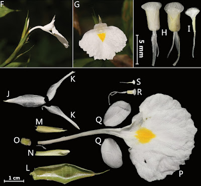 | Figure 1. Monolophus odontochilus Y.H. Tan & H.B. Ding, sp. nov. F flower (side view) G flower (front view) H anther with stigma and crest (front and back view) I stigma J dorsal corolla lobe K lateral corolla lobes L bracts M bracteoles and young flower N calyx O ovary P labellum and floral tube Q lateral staminodes R stamen and stigma S ovary with style.