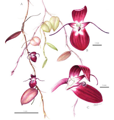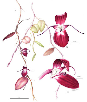 | Figure 3. Color drawing of Bulbophyllum papuaense. A Plants B front view of flower C lateral view of flower. |