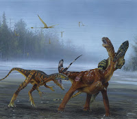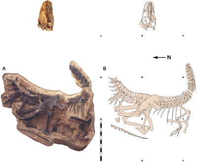 | Figure 1: Quarry map of DINO 11541. Photograph of a painted cast of parts of the skeleton and skull of DINO 11541 in their original positions with respect to each other (A) and an explanatory line drawing taken from original quarry photos (B). Photos by Dan Chure. Scale bar equals one m. |