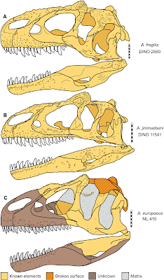 | Figure 16: Skulls of Allosaurus in left lateral view. (A) Allosaurus fragilis (DINO 2560). (B) Allosaurus jimmadseni (DINO 11541). (C) Allosaurus europeaus (ML 415). Scale bars equal 10 cm. |