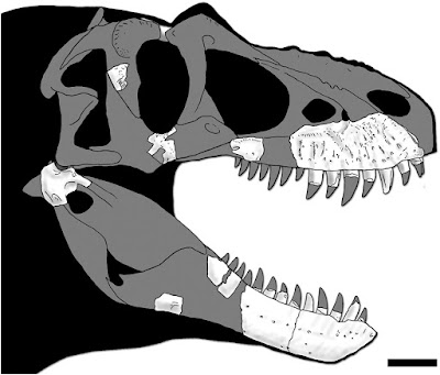 | Skull reconstruction of Thanatotheristes degrootorum holotype TMP 2010.5.7. Known bones appear in white. Missing bone morphologies and proportions are based on the holotype of Daspletosaurus torosus (CMN 8506). Scale bar equals 10 cm. |