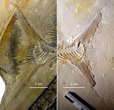 | Figure 7. Caudal fin of Thiollierepycnodus wagneri from Cerin, France. A, (MHNL20015214). B, (MHNL20015204). |