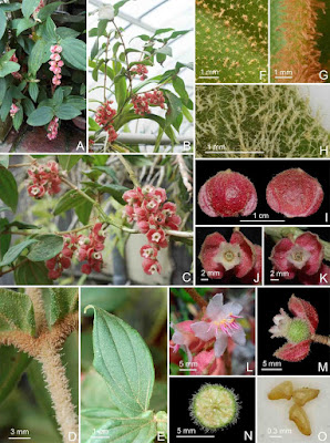 | Fig. 2. Medinilla vexillifer C.W. Lin & Rubite. A, B, C. Habit; D. Stem; E. Leaf; F. Portion of leaf adaxial surface, showing stellate trichomes; G. Portion of leaf abaxial surface, showing dendroid trichomes; H. Dendroid trichomes; I. Secondary bracts; J, K. Calyx and secondary bracts; L. Flower; M. Hypanthium and secondary bracts; N. Cross section of an ovary; O. Seeds. B-O from C.W. Lin 676 (TAIF). |