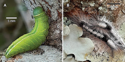 | FIGURE 5. Lepidoptera recorded on Combretum eugeneanum. A. Larva of the moth Desmeocraera vernalis (family Notodontidae, subfamily Dicranurinae), hitherto only recorded as using members of Combretum as food plant. B. Hairy larvae of a moth that probably belongs to family Erebidae, subfamily Lymantriinae, feeding on bark-growing lichens. It is not host-plant specific and larvae were also seen feeding on the bark of other tree species. Photographs: G. Lang. |