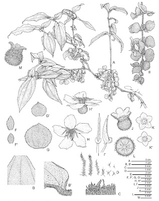 | Fig. 1. Medinilla vexillifer C.W. Lin & Rubite. A. Habit; B, B'. Part of leaf, adaxial and abaxial surfaces; C. Vestiture of stem; D. Stellate and dendroid trichomes; E. Inflorescence; F, G. Bracts and secondary bracts; H, H'. Flower, face and side views; I. I'. Stamens, ventral and side views; J. Hypanthium; K, K'. Calyx, showing 4 and 5-merous conditions; L. Cross section of an immature fruit; M. Fruit. All from C.W. Lin 676 (TAIF). |