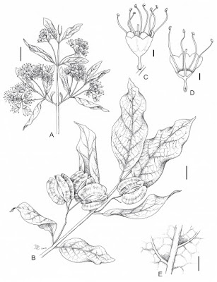 | FIGURE 3. Combretum eugeneanum R.G.C.Boon, Jordaan & A.E.van Wyk. A. Flowering branchlet. B. Fruiting branchlet. C. Flower. D. Flower with half removed. E. Hair-tuft domatia in principal lateral vein axils of abaxial leaf blade surface. Scale bar = 10 mm (A & B), or 1 mm (C–E). A based on Ward 2644, B based on Moll 5632, C based on Ward 2661, D based on Moll 4359. Artist: Daleen Roodt. |