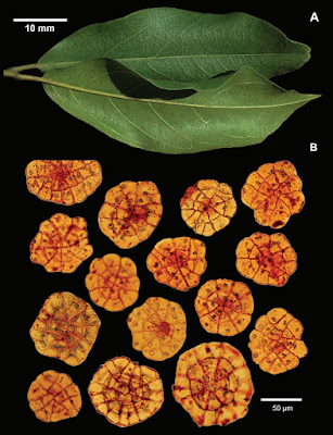| FIGURE 2. Combretum eugeneanum, leaf and scale morphology. A. Leaves, showing adaxial (top) and abaxial (bottom) lamina surfaces. Note the thin glutinous (shiny) secretion on the lamina surfaces and raised tertiary veins on the adaxial surface. B. Selection of scales (stained with Sudan IV) from leaves of the same collection (Ward 1970) to show variation in size, shape and number of cells. Scale bar in mm refers to leaves; one in µm to scales. Photographs: R.G.C. Boon (leaves) and A.E. van Wyk (scales). |
