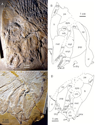 | Figure 4. Cranium of Thiollierepycnodus wagneri from Cerin, France. A, photograph of specimen (MHNL20015207). B, camera lucida drawing of (MHNL20015207). C, photograph of specimen (MHNL20015202). D, camera lucida drawing of (MHNL20015202). Due to reasons of space, the heads are rotated from their ‘normal’ position (approximately 20 degrees in Fig. 4A, B and approximately 40 degrees in Fig. 4C, D). |