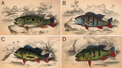 | Fig. 1. Drawings of Cichla from Guyana and neighboring regions in Venezuela and Brazil as published in Schomburgk (1843). Scientific names assigned by William Jardine are followed by "Schomburgk Drawing" number, locality as published, and current status in parentheses. A. Cychla argus, Valenciennes? (No. 47): Essequibo as well as Rios Branco and Negro (synonym of Cichla orinocensis Humboldt 1821). B. Cychla flavo-maculata (No. 45): Rio Negro and Padauiri (synonym of Cichla temensis Humboldt 1821). C. Cychla nigro-maculata (No. 46): having same habits and residing in the same situations with the last [C. flavo-maculata] (synonym of C. ocellaris Bloch and Schneider 1801). D. Cychla trifasciata (No. 59): Rio Negro and in the Padauiri (synonym of C. temensis Humboldt 1821). |