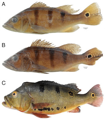 Abstract A new species of peacock bass, Cichla cataractae, is distinguished from all congeners by molecular evidence and unique patterns of adult and juvenile pigmentation. Juveniles (<150 mm SL) have sides of body dominated by a series of three conspicuous dark blotches with the one below soft dorsal fin largest, attenuated posteriorly (long teardrop shape) but distinctly separated from elliptical caudal blotch; same blotches eventually with pale border (ocellated) in largest juveniles. Adult pattern on sides dominated by two distinct dark blotches, each one ocellated; anterior blotch rounded, located below anterior base of spinous dorsal fin and not extending above anterior lateral line; posterior blotch highly irregular in shape, located below soft dorsal fin and often displaced dorsally; additional dark blotch below posterior base of spinous dorsal fin generally absent or small, ocellated or not, and level with anterior blotch; vertical bars on sides generally absent or faint; postorbital stripe always present, highly broken into irregular series of dark spots, each one usually ocellated. Cichla cataractae is endemic to the Essequibo Basin where it typically inhabits rocky shoals in river channels with swift current. The new species is sympatric with the more widely distributed C. ocellaris, a species that prefers lentic habitats. Molecular analysis supports C. cataractae as a distinct lineage in a clade of Cichla containing C. temensis, C. melaniae, C. mirianae, C. piquiti and C. pinima. The oldest extant specimens of the new species were collected by Carl H. Eigenmann in 1908 and documented in his seminal "The Freshwater Fishes of British Guiana" (Eigenmann, 1912).