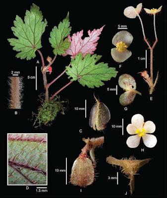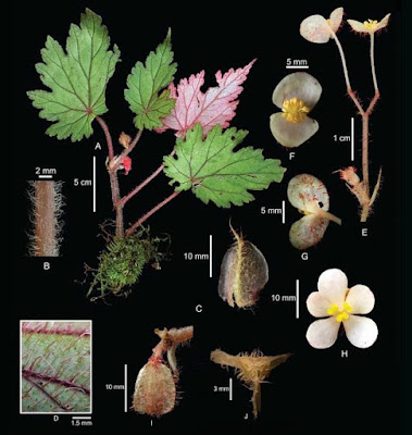 | FIGURE 2. Begonia medicinalis. A. Habit. B. Petiole with hairs. C. Stipule. D. Adaxial leaf surface. E. Male inflorescence. F. Male flower (front view). G. Male flowers (rear view). H. Female flower (front view). I. Fruit. J. Ovary cross section.