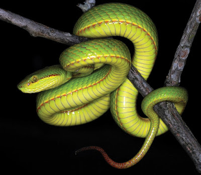 | Figure 5. Trimeresurus salazar sp. nov. paratype female BNHS 3555 in life. a. Body habitus; b. Left lateral view of head. | Trimeresurus salazar sp. nov. Etymology: The specific epithet is a noun in apposition for J.K. Rowling’s fictional Hogwarts School of Witchcraft and Wizardry’s co-founder, Salazar Slytherin. He was a Parselmouth that links him to serpents. Suggested common name: Salazar’s Pit Viper. Diagnosis: A species of the genus Trimeresurus with (1) 1st supralabial fused with nasal; (2) 19–21 moderately keeled dorsal scale rows at midbody; (3) dorsal colouration greenish yellow in both sexes; (4) an orange to reddish stripe extends from the posterior borders of the preocular, running through the lower margin of the eyes to the lateral side of the nape in males; (5) ventrolateral stripe predominantly yellow with a faint orange at the base in males, yellow in females; (6) tail to total length ratio (TaL/TL) 0.18 in males, 0.14 in females; (7) short, bilobed hemipenis reaching 8th caudal scale; (8) 6 palatine, 15 pterygoid and 19 dentary teeth.  | Figure 7. Trimeresurus salazar sp. nov. juvenile male from Pakke Tiger Reserve photographed in 2008. Photo by Aamod Zambre and Chintan Seth, Eaglenest Biodiversity Project. |