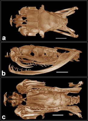 | Figure 4. Micro-CT volume rendered images of the skull and mandibles of Trimeresurus salazar sp. nov. holotype male BNHS 3554. a. Dorsal view; b. Left lateral view; c. Ventral view (lower jaw clipped for representation purpose). Scale bars: 2.5 mm (a, b); 2 mm (c). | Natural history notes: the type specimens were found during night search between 1800–2200 hours along a road. Both individuals were found coiled on shrubs along the road. A third individual was seen but escaped in the thick undergrowth. Three individuals were seen during night searches in six nights. Other serpent species observed at the locality include Boiga gokool (Gray, 1834), Boiga cyanea (Duméril, Bibron & Duméril, 1854), and Lycodon jara (Shaw, 1802). For now, the new species is known only from the type locality. The specimens, ZMUC R69255 & ZMUC R69256 were collected from Assam and it is likely that the new species may occur in the adjoining state sharing similar biotope.  | Figure 6. ML phylogeny of selected members of the subgenus Trimeresurus based on partial sequences of mitochondrial 16S and ND4 gene generated through 1000 non-parametric bootstrap pseudoreplicates under the GTR + G model of sequence evolution. Numbers at nodes represent ML bootstrap support and BI posterior probabality. See Appendix III for a complete tree. |