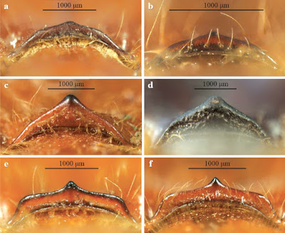 | Fig. 3 – Anterior pronotal border (APB) of two specimens for each investigated taxonomic unit: a-b, P. flavohirtus complex from Fare (SA) and Massawa (ER); c-d, Pseudoathyreus zianii n. sp. from Riyadh (SA) and Kerman (IR); e-f, P. orientalis from Jaisalmer (IN) and Pilani (IN). See Table 2 for country codes. |