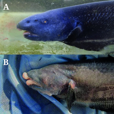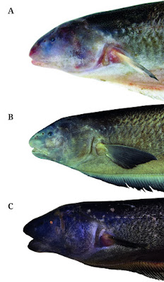 | FIGURE 11: Heads of male Tenebrosternarchus preto. A. ANSP 198373 (302 mm TL) from the río Apure at San Fernando de Apure, Venezuela B. MUSM 59463 (291 mm) and C. MUSM 59447 (320 mm TL) both from the río Nanay at Iquitos, Peru. |