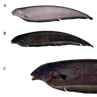 | FIGURE 1: Lateral view of live Tenebrosternarchus preto. A. MUSM 54656 (243 mm TL) from the río Amazonas at Iquitos, Peru; B. ANSP 207797 (232 mm TL) from the rio Negro downstream from Barcelos, Brazil; and C. Detail of the head of ANSP 207797 (232 mm TL). |