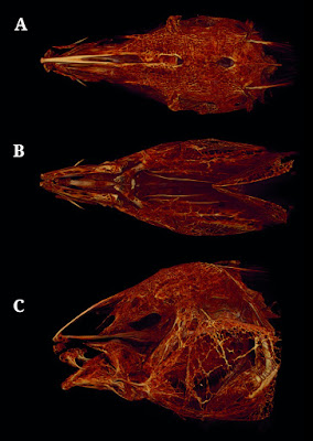 | FIGURE 2: CT scan reconstructions of Tenebrosternarchus preto, MUSM 59447 (male) 264 mm TL in dorsal A., ventral B., and lateral C. views. |