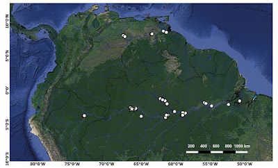 Distribution. The collection localities of samples analyzed in this study are summarized in Fig. 12. Our examined material of Tenebrosternarchus ranges from the western Amazon at Iquitos, Peru to the mouth of the rio Xingu in Pará, Brazil, the rio Negro, from Manaus to Barcelos, and the Orinoco Basin in Venezuela, from the río Apure at San Fernando de Apure to near the mouth of the río Orinoco in Delta Amacuro. Crampton, Cella-Ribeiro (2013) also report this species from the Madeira drainage above the extensive system of cataracts beginning at Porto Velho.