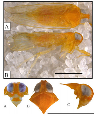 Haplaxius dougwalshi sp. n. Diagnosis. This species is distinguished by a combination of bright orange coloration, facial color pattern of an orange frons with white arch traversing width of frons resulting in a trapezoidal shape dorsad of frontoclypeal suture, large, incurved processes on lateral margins of the pygofer and aedeagus with curved spine near midlength of shaft. Plant associations. Pata de gallo palm (Asterogyne martiana), Arecaceae. Distribution. Costa Rica (Heredia, Puerto Viejo de Sarapiqui) Etymology. The specific name given is an honorarium in reference to the lead authors professor and chair during graduate school (Ph.D.), Dr. Doug Walsh at Washington State University, who’s signature mustache resembles the color pattern observed on the frons of the novel taxon. Brian W. Bahder, Edwin A. Barrantes, Marco A. Z. Echavarria, De-fen Mou, Ericka E. Helmick & Charles R. Bartlett. 2020. A New Species of Planthopper in the Genus Haplaxius (Hemiptera: Auchenorrhyncha: Fulgoroidea: Cixiidae) on Palms in Costa Rica and A New Country Record for Haplaxius skarphion. Zootaxa. 4767(4); 543–552. DOI: 10.11646/zootaxa.4767.4.4