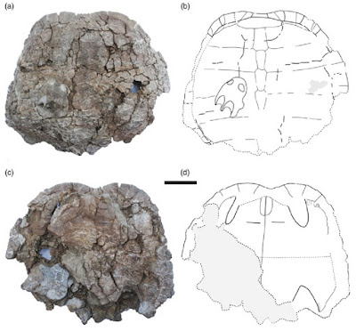 | Fig. 1. Kalasinemys prasarttongosothi n. gen. n. sp. (KS34-190, holotype) from the Phu Kradung Formation, Phu Noi locality, Kalasin Province, Thailand. Carapace and skull in dorsal view (a, b); plastron in ventral view (c, d).