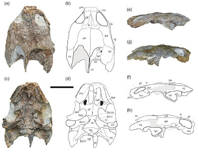 | Fig. 2. Kalasinemys prasarttongosothi n. gen. n. sp. (KS34-190, holotype) from the Phu Kradung Formation, Phu Noi locality, Kalasin Province, Thailand. Skull in dorsal (a, b), ventral (c, d), left lateral (e, f) and right lateral (g, h) views.