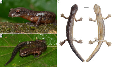 | Holotype adult male Bolitoglossa copinhorum (CM 163182) from Refugio de Vida Silvestre Mixcure, Intibuca; (A) details of head and anterior portion of body in lateral view; (B) dorsolateral view of entire body; and (C) dorsal and ventral aspects of the preserved holotype specimen. |