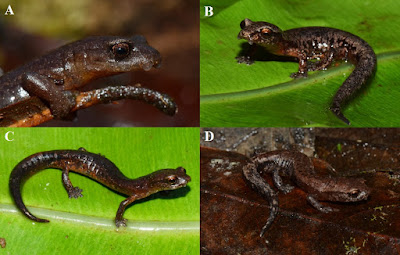 | Variation in Bolitoglossa copinhorum: (A) an adult male from San Pedro La Loma (CM 170771); (B) an adult male from the Sierra de Opalaca, Intibuca (CM 170752); (C) an adult female from San Pedro La Loma (CM 170770); (D) a juvenile from the Sierra de Opalaca, Intibuca. |