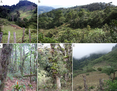 | Habitat at other localities where Bolitoglossa copinhorum occurs: (A) Zacate Blanco, (B) San Pedro la Loma, (C) Agua Negra in the nuclear zone of Opalaca, (D) San Pedro La Loma, (E) Guajiquiro, Departamento de La Paz. |