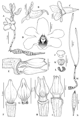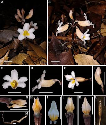| FIGURE 1. Gastrodia gunatillekeorum Bandara, Priyankara & Kumar sp. nov. A. Plant (CB-201804-01-Holotype). B. Flowering plant. C. Front view of flower. D. Lateral view of flower. E. Dorsal view of flower. F. Flower bud with bract. G. Side view of lip and column. H. Ventral view of column. I. Dorsal view of lip. J. Dorsal view of column. K. Ventral view of lip. L. Capsule. M. Tuberous rhizome