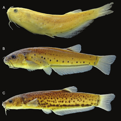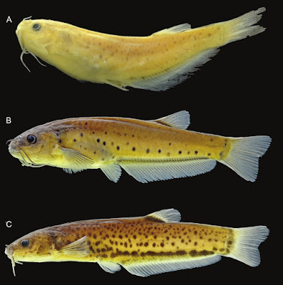 | FIG. 2. Comparative illustrations of species of Trichogenes. A. Trichogenes beagle, 35.5 mm SL (MZUSP 125019, holotype). B. T. claviger, 47.7 mm SL (MZUSP 124882). C. T. longipinnis, 56.8 mm SL (MZUSP 111153). | Trichogenes beagle, new species Etymology: The species epithet honors the Laboratory of Molecular Systematics – Beagle, Department of Animal Biology, Universidade Federal de Viçosa, the lab where the only specimens of the new species were found preserved. Mário de Pinna, Vinícius Reis and Heraldo Britski. 2020. A New Species of Trichogenes (Siluriformes, Trichomycteridae), with A Discussion on the Homologies of the Anterior Orbital Bones in Trichomycterids and Other Loricarioids. American Museum Novitates. 3951; 1-27. DOI: doi.org/10.1206/3951.1