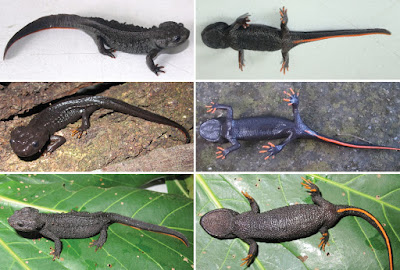 Figure 9. Dorsal and ventral views of the new taxa in life. Top: Tylototriton pasmansi sp. nov. (holotype); Center: Tylototriton pasmansi obsti ssp. nov. (holotype); Bottom: Tylototriton sparreboomi sp. nov.