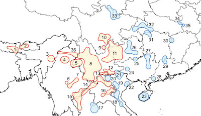 The numerical identification corresponds to the different species and undescribed taxa as follow: 1 T. himalayanus 2 T. cf. himalayanus (Bhutan) 3 T. cf. verrucosus (Manipur) 4 T. kachinorum 5 T. verrucosus 6 T. ngarsuensis 7 T. shanorum 8 T. shanjing 9 T. pseudoverrucosus 10 T. taliangensis 11 T. kweichowensis 12 T. yangi 13 T. pulcherrimus 14 T. anguliceps 15 T. uyenoi 16 T. podichthys 17 T. panhai 18 T. notialis 19 Tylototriton taxon 2, this study 20 Tylototriton taxon 3, this study 21 T. ziegleri 22 T. vietnamensis 23 T. hainanensis 24 T. cf. hainanensis (Baise) 25 T. cf. wenxianensis (Libo) 26 T. cf. wenxianensis (Guizhou) 27 T. asperrimus 28 T. cf. asperrimus (Guangdong) 29 T. lizhengchangi 30 T. liuyangensis 31 T. broadoridgus 32 T. cf. wenxianensis (Chongquing and Hubei) 33 T. wenxianensis 34 T. dabienicus 35 T. anhuiensis and 36 T. panwaensis. |