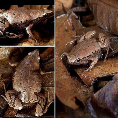Holotype of Elachistocleis araios sp. n., female, in life. Above left, Lateral view; below left, dorsal view; right, frontal view. |