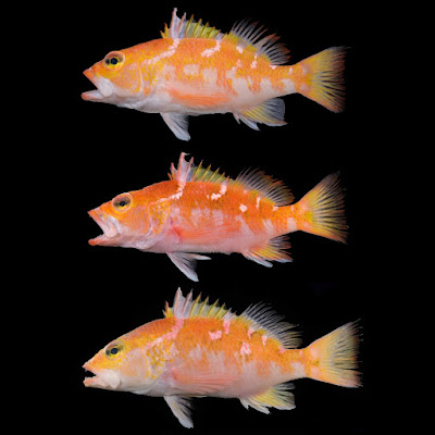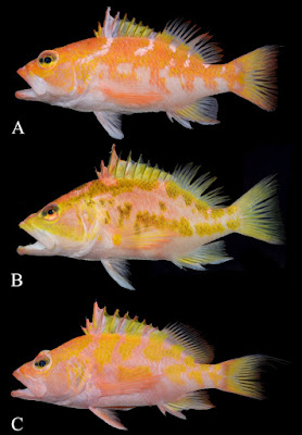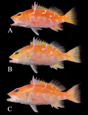 | FIGURE 2. Paratypes of Plectranthias purpuralepis sp. nov. A. NMMB-P32943, 143.6 mm SL; B. NMMB-P33386, 144.7 mm SL; C. NMMB-P32937, 146.6 mm SL. |