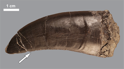 | Fig 3. Shed lateral tooth of Allosaurus sp. (MWC 5011) found at the Mygatt-Moore Quarry, white arrow indicates the distal denticles. Mesial denticles are present on such teeth, but were not preserved in this specimen. |